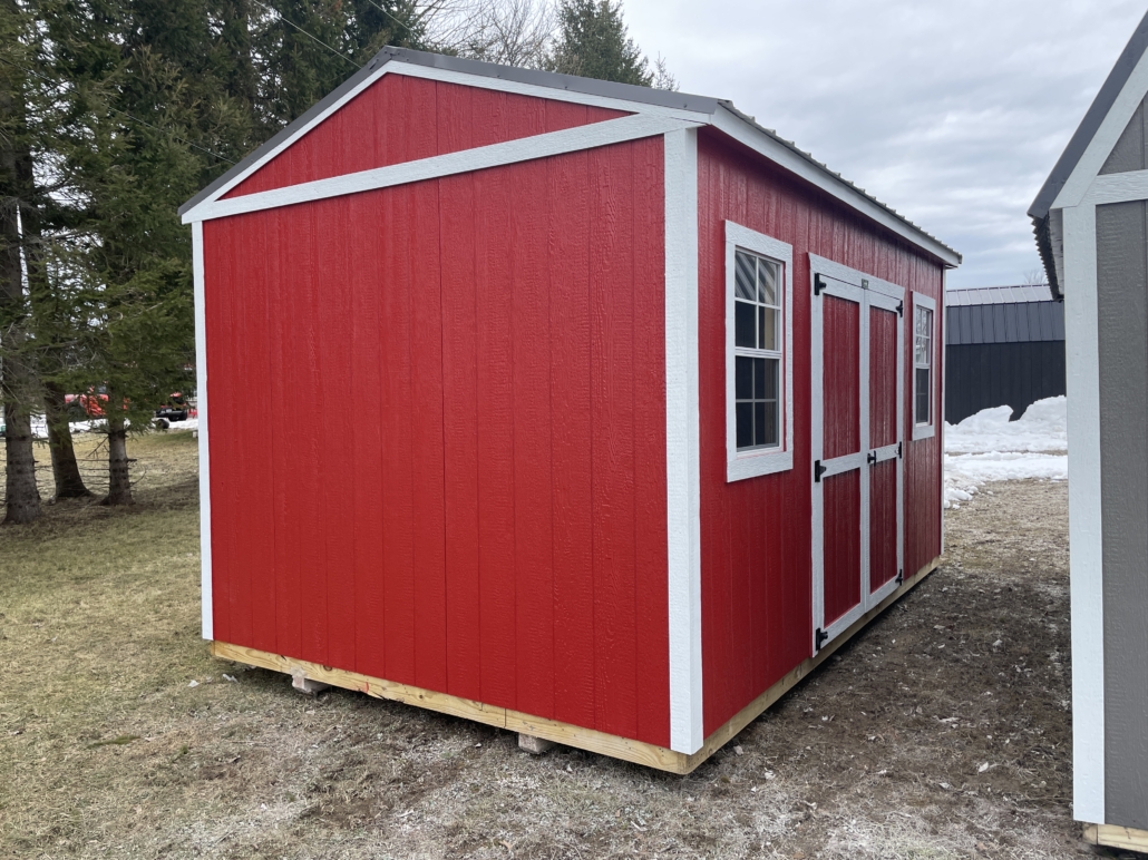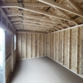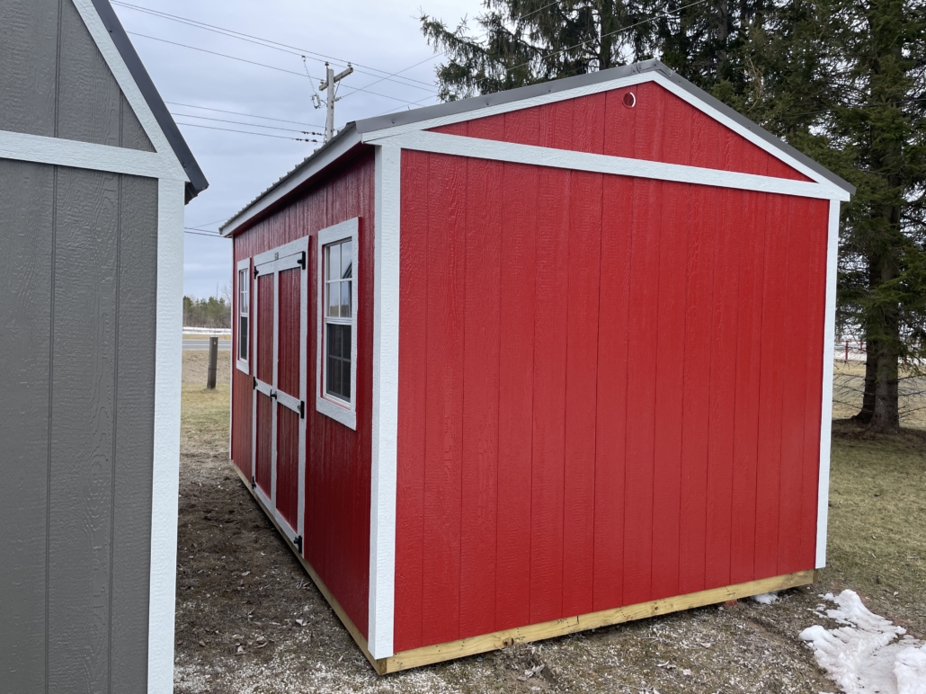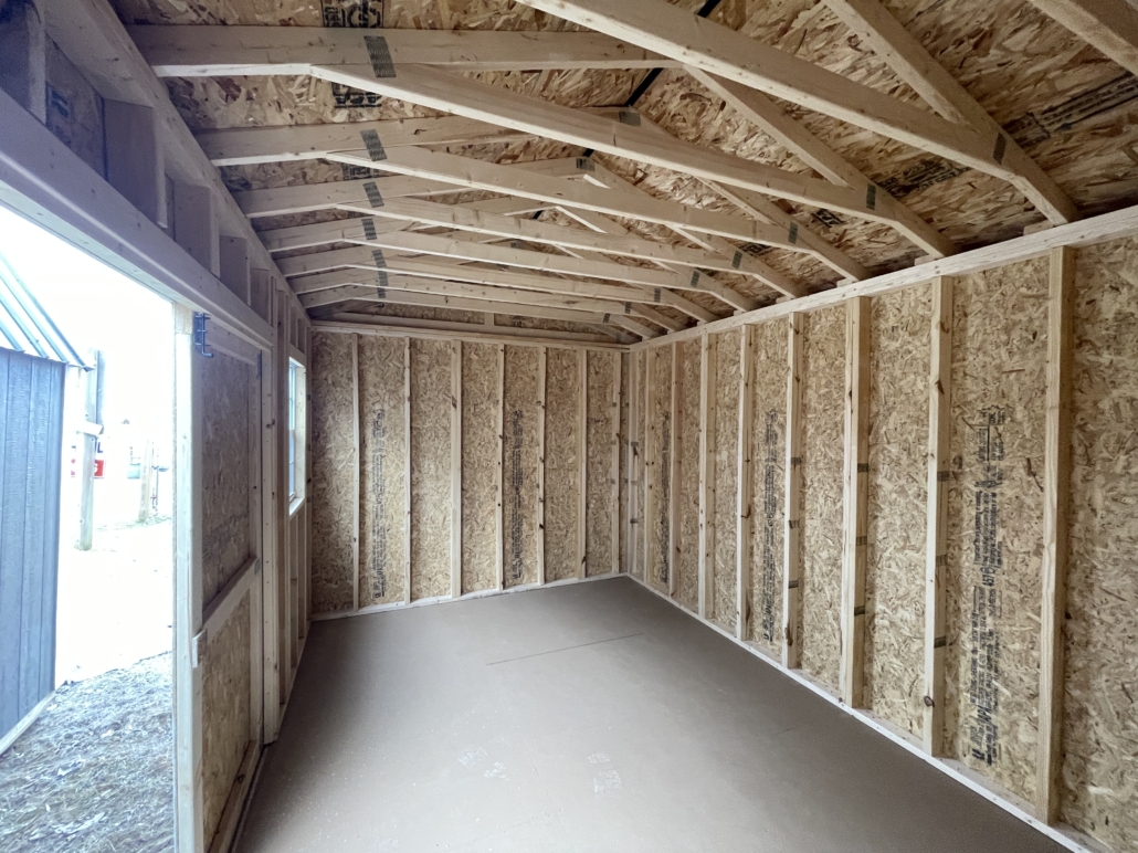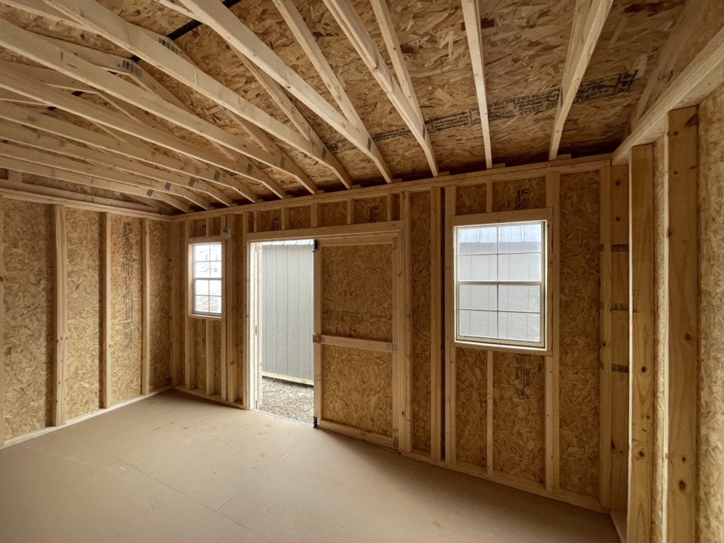 - Low pitched gable roof with 92″ interior wall height
